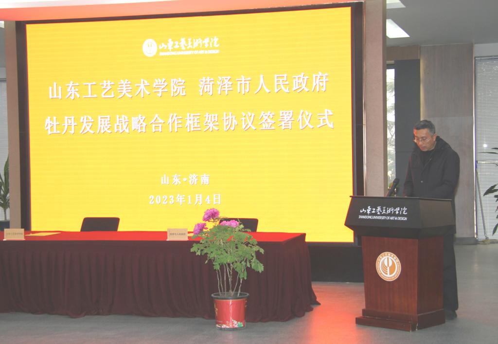 董占军在致辞中提到,自2009年学校与菏泽市建立合作关系以来,双方围绕黄河文化、牡丹文化主题,创新市校融合发展机制,深入挖掘菏泽文化资源,在以牡丹为突出元素的设计、智能创意家居设计研发、工艺品产业转型升级和电商广告园区建设等方面,取得了积极成效,结下了深厚的友谊。本次牡丹发展战略合作框架协议的签署,标志着双方以专业、人才和创新发展为核心合作的进一步深化,对贯彻落实“黄河国家战略”、深入推进文化“两创”、打造菏泽“一都四乡”文化品牌具有重要意义。学校将以此为契机,与菏泽市政府紧密对接,建立校地合作发展常态交流机制,坚持以项目为抓手,充分挖掘利用菏泽深厚的牡丹文化资源和黄河文化积淀,讲好菏泽故事,传播牡丹文化,为推动党的二十大精神落地落实、持续提升“中国牡丹之都”品牌影响力做出山工艺贡献。