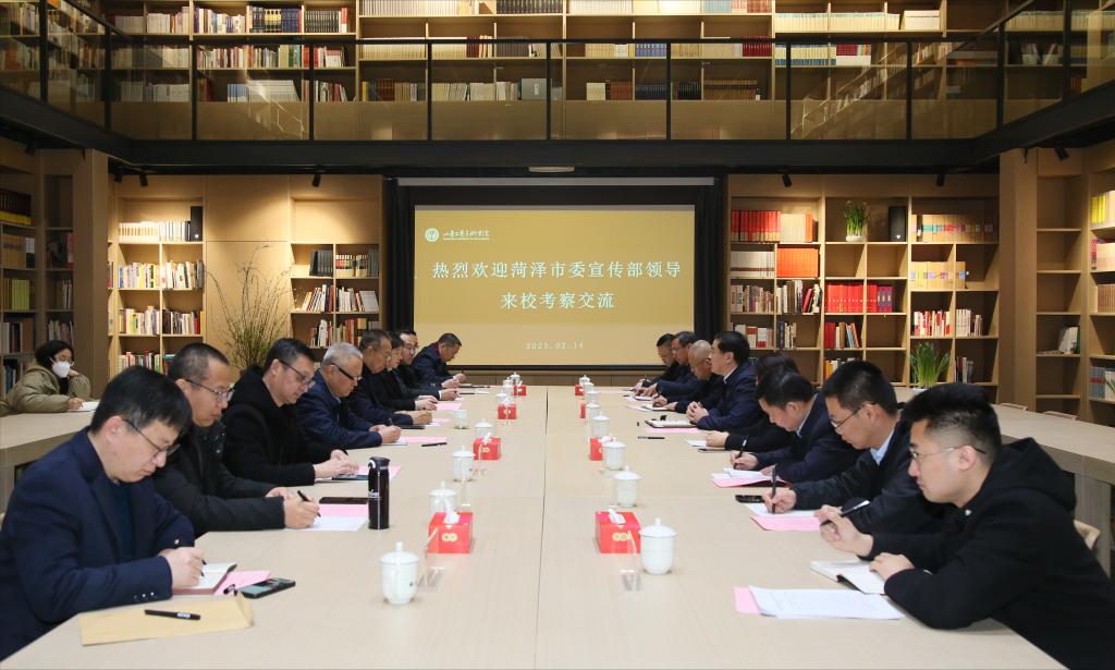 2月14日下午,菏泽市委常委、宣传部部长周生宏,市委宣传部常务副部长、市文明办主任刘芙蓉一行8人来永利官网座谈交流。院长潘鲁生,副院长张艳霞,纪委书记苗新民,副院长董占军,党委委员、宣传部部长韩文涛会见来宾并座谈。