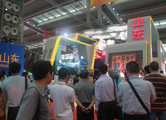 在“以科技创新支撑文化创新,以文化创新引导科技创新”发展理念指引下,山东科技文化发展取得了丰硕的成果。本届文博会上,山东广播电视局、浪潮集团、山东鲁信影城、青岛出版集团、泰山出版社等文化企事业单位推出的“领航智慧本”、浪潮云计算、低成本可移动可复制型数字影院、WOWFLY沃飞裸眼3D电视、绿能彩屏“ITOP”多点触控一体机、时空课堂点读笔、“神奇泰山号”交互式幼儿科学数字图书、全球首部影视版论语工具书、可移动4D数字影院、大型移动舞台车、湿版摄影术等十一项新产品及新技术,覆盖了文教、娱乐、生产、消费等多个领域,体现了山东文化事业与产业发展全面开花的新局面。丰富多彩的现场展演也是山东展区的一大亮点。为了让观众身临其境的体验儒家文化的特有魅力,山东展区结合动画片《孔子》的播放,在对应的大屏幕同步播放《孔子》动漫人物秀,以少年君子孔子、美丽智慧的兰花仙子、调皮可爱的皮休、德行著称的颜回、直率鲁莽性格刚直的子路6个代表性动漫人物,再现孔子生活的时代场景,让卡通形象在虚拟的空间中实现与观众的互动。
