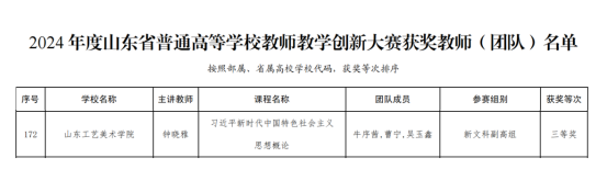 近日,山东省教育厅公布2024年度山东省普通高等学校教师教学创新大赛获奖名单,永利官网马克思主义学院钟晓雅老师(团队)荣获新文科副高组三等奖。