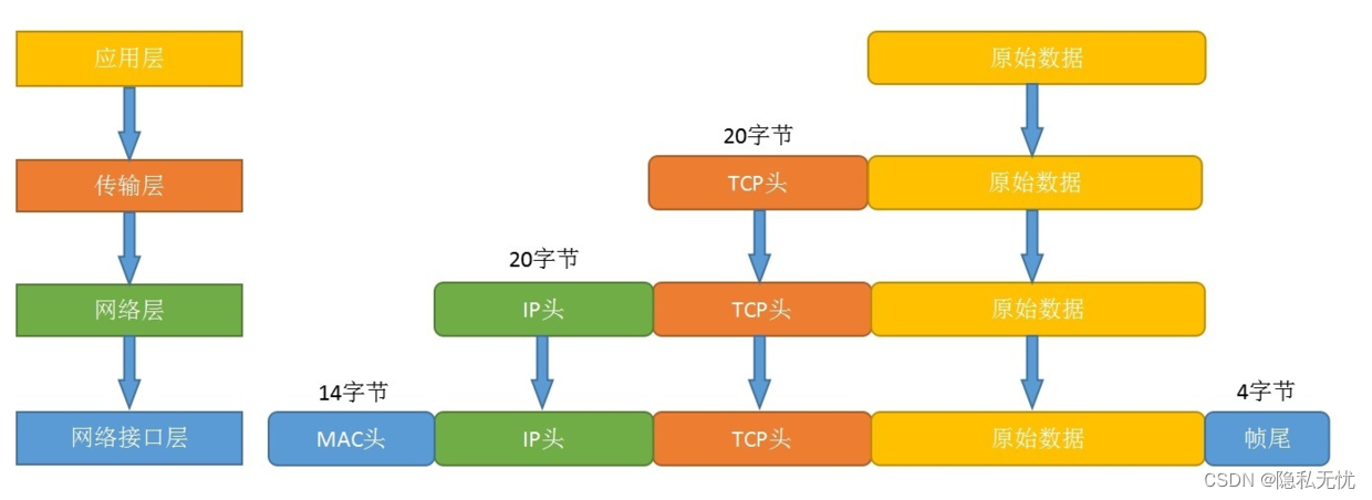 每个包从前往后依此被附加了以太网包首部、IP包首部、TCP包首部(或UDP包首部)以及应用的包首部和数据,包的最后则追加了以太网包尾(Ethernet Trailer)。