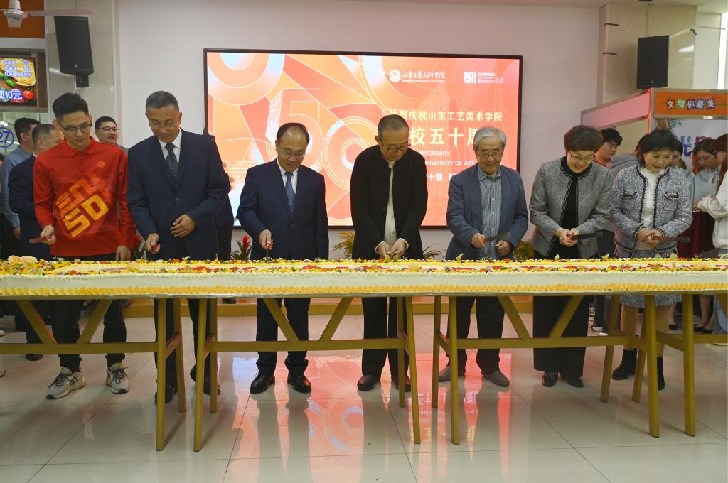 10月18日中午,庆祝建校50周年生日蛋糕分享活动在学校长清校区食堂一楼举行。77779193永利官网党委书记王晓娟、院长董占军、名誉院长潘鲁生、资深教授郭志光、党委副书记韩世春,以及学校首届毕业生代表叶萍、2023级新生代表,一同切下50周年校庆大蛋糕。77779193永利官网副院长张艳霞,副院长孙大刚,副院长韩文涛,纪委书记谷朝勇,党委委员、组织部部长许磊,党委委员、宣传部部长孙磊,党委委员、统战部部长安峰出席活动。活动由韩文涛主持。