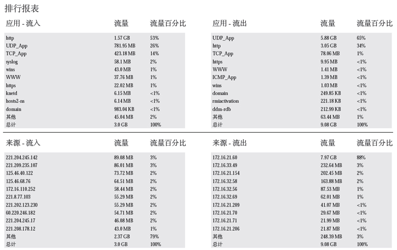 从这个报表上大家可以看到,40分钟的时间内一共向外流出了9.08G的数据,其中“172.16.21.60”(图书馆电子阅览室)这一用户传送了总量的88%,即7.97G,也就是说在这短短40分钟的时间内,这一个用户就曾霸占84%左右的出口流量长达近20分钟时间,向外提供资源下载。幸好这是在晚上,周一的晚上,试想如果是在白天,试想如果有两个这样的用户,那么会是什么结果呢?